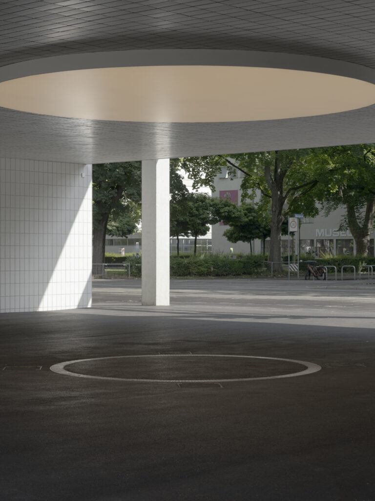 At the summit of a 27 meter antenna, four microphones capture the city’s soundscape in continuous 360° recording. The audio is replayed twelve hours later, emerging from a sound-equipped drain embedded in the ground at the building’s entrance.